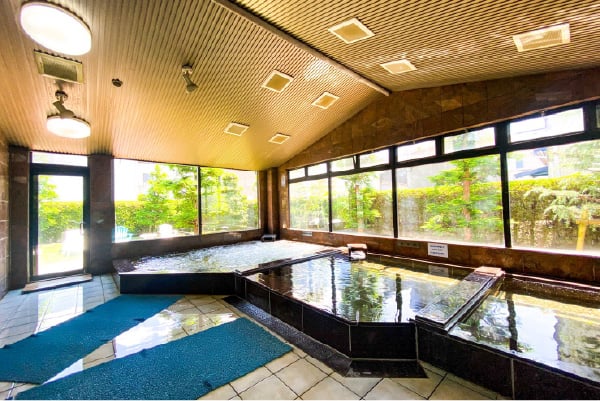 庭の見える浴槽は気分もリラックス。毎朝の清掃時、湯水の入れ替えをし、常時オーバーフローしている水風呂は清潔そのもの。水質管理も徹底しています。浴室の至る所には、世界中から集められた色々な石も張り付けられています。営業時間中は、いつでも入泉、退泉は可能です。朝早いお仕事でもOK!