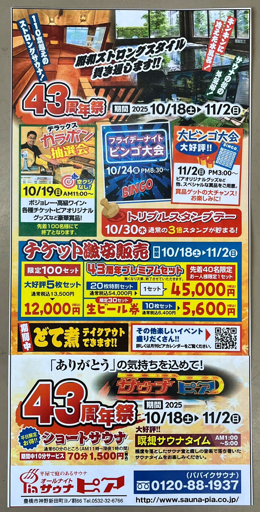豊橋市の男性専用サウナ、サウナピアは年中無休、オールナイト営業