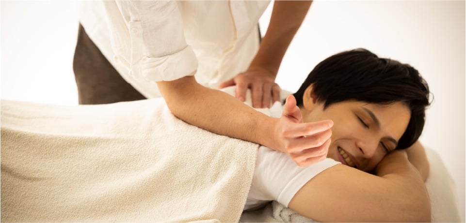 肩から背中、腰を中心にじっくり時間をかけてほぐして行き、首、首筋、腕、太もも、お尻、ふくらはぎをほぐします。